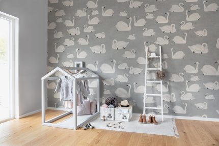 Fototapetul personalizat 3D Cygne, de la Rebel Walls, cu lebede albe pe un fundal într-o nuanță deschisă de gri, este