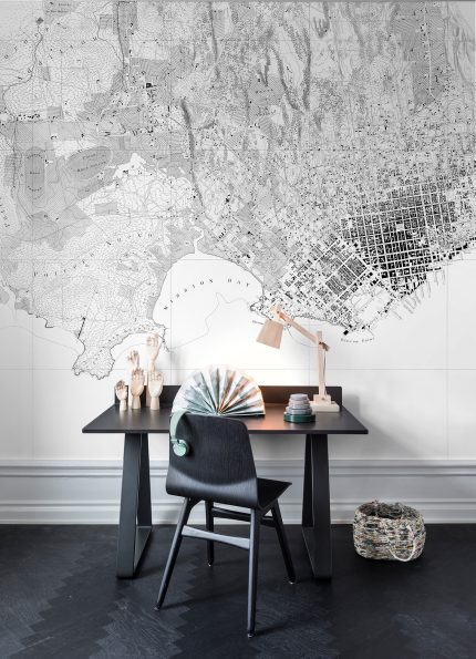 Pierde-te și regăsește-ți locul în această versiune alb-negru a fototapetului Treasure Hunt. O compilație de tipuri diferite de hărți alcătuiesc