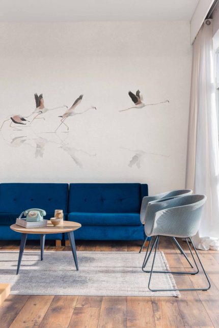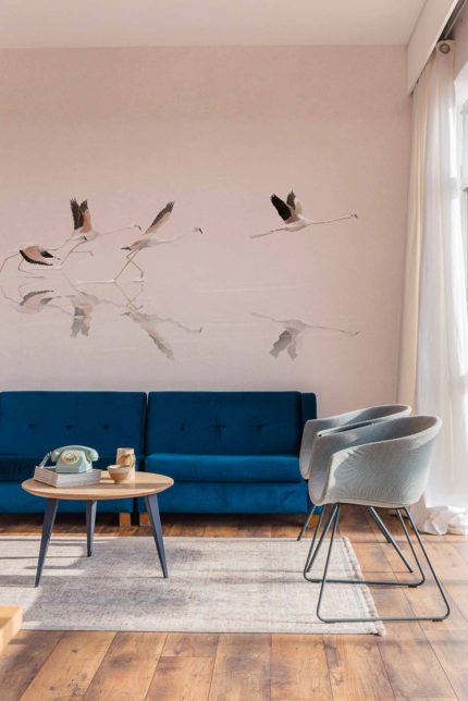 O familie de flamingo care își ia zborul în zori, purtând emoția unei călătorii migratoare. O atmosferă epică, cu accente