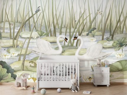 Tapet personalizat cu un design delicat, ce prezintă două lebede albe elegante, înotând printre nuferi. Un tapet perfect pentru a