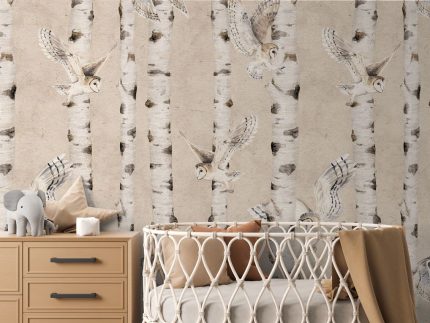Un decor magic! Adaugă o notă de basm camerei cu acest tapet bej, cu copaci mesteacăn și bufnițe delicate. Perfect