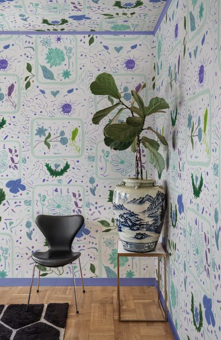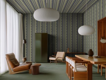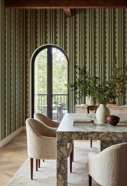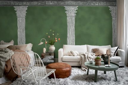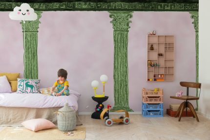 Descoperiți tapetul Aegis Green, o colaborare extraordinară cu John-John. Inspirat de arhitectura clasică, coloanele sale corintice și modelul de cheie