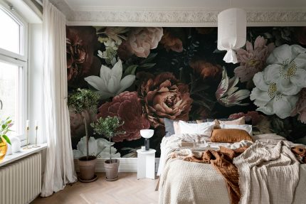 Transformă-ți locuința într-o grădină secretă! Acest fototapet floral aduce o notă dramatică și elegantă oricărui spațiu. Perfect pentru dormitoare, livinguri