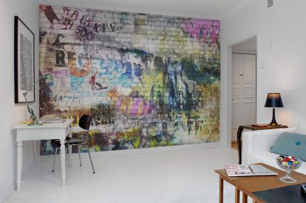 Creează o alee cu caracter urban, în propria ta casă. Grafitti pe un perete alb. Informații generale:personalizat:da|Informații generale:mostră disponibilă:Da|Fototapet >