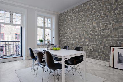 Un perete neted și elegant construit din plăci de piatră patinate. Informații generale:personalizat:da|Informații generale:mostră disponibilă:Da|Fototapet > Detalii tehnice:Material fototapet:netesut (non-woven)|Fototapet