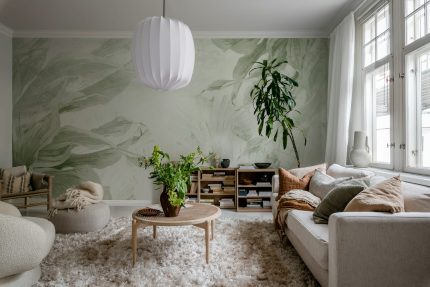 Evadare în natură cu acest fototapet încântător! Decor floral delicat, pe un fundal verde relaxant. Ideal pentru living sau dormitor.