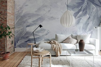 Creează un ambient relaxant cu acest fototapet cu design floral în nuanțe delicate de albastru. Ideal pentru living sau dormitor.