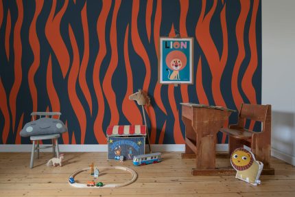 Plonjează în atmosfera îndrăzneață a Zebra Lines, Blue & Red, un tapet care vorbește despre contraste îndrăznețe și frumusețe neîmblânzită.