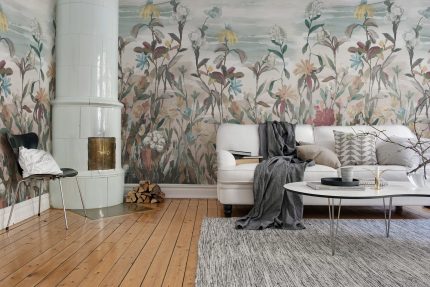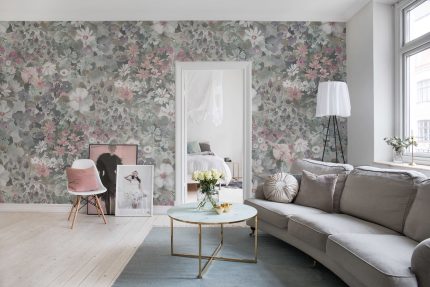 Un model ademenitor cu flori și frunze care se revarsă ușor pe perete. Culorile sunt estompate și dau impresia că