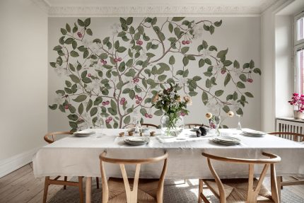 Modelul maiestuos Cherries prezintă un cireș care se înalță către cer. Fructele coapte, frunzele și florile drăguțe împodobesc peretele. Nuanța