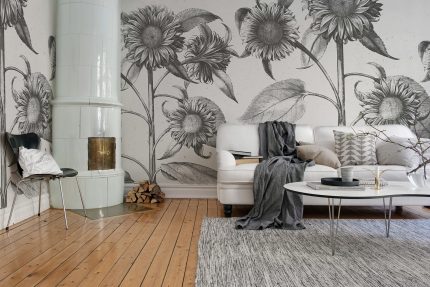 Florile-soarelui îndrăznețe ajung până la tavan. Aceste flori prietenoase sunt atât drăguțe dar oferă și o impresie artistică. Varianta Peach