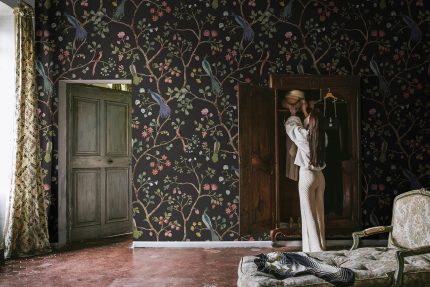 Songbirds este un tapet sofisticat cu ramuri frumoase de copaci care cresc peste perete, împodobite cu flori delicate, fructe de