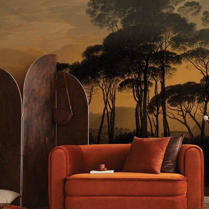 Un decor misterios și elegant! Transformă-ți casa cu un fototapet ce aduce farmecul unui peisaj crepuscular cu pini umbrelă. Perfect