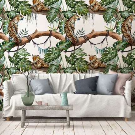 Jungle Shell este o tapetă cu un design exotic, cu leoparzi relaxați pe ramuri de copaci, într-o junglă luxuriantă. Acest