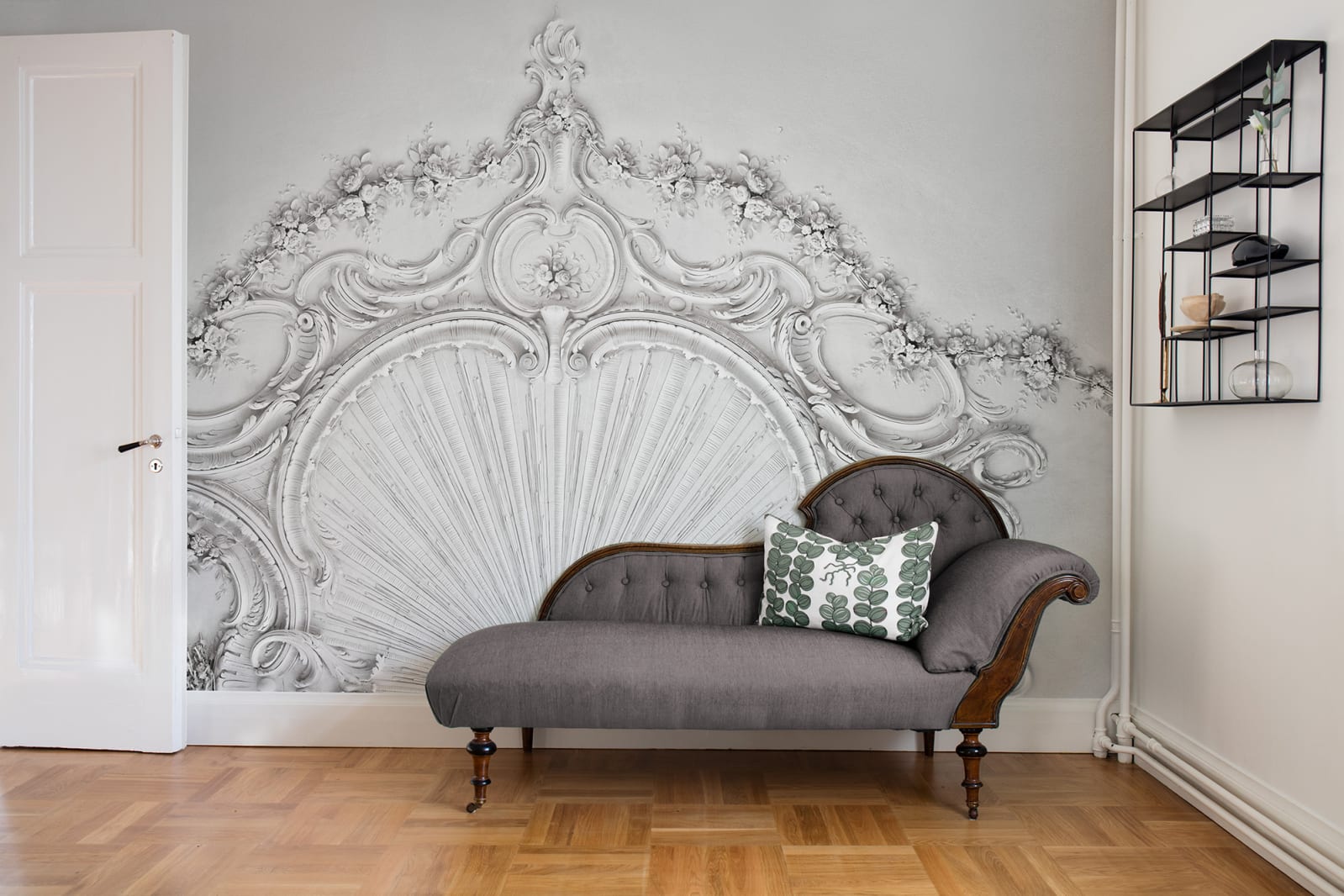Stucco Gloria este un fototapet plin de extravaganță care nu se scuză și adoră atenția. Și are toate motivele necesare de vreme ce are toate aceste forme și detalii franceze. Piesa originală a fost transferată într-un mod elegant în fototapet. Joacă-te cu formele și îl poți așeza în oglindă sau îl poți duplica.