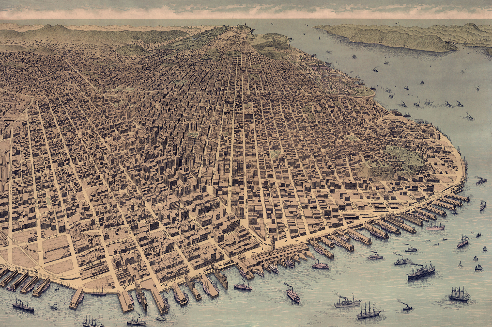 Adaugă mai mult spațiu cu fototapet! O scenă cu profunzime, pentru harta originală din 1912 care descrie povestea extraordinară a reconstrucției centrului din San Francisco, după ce orașul a fost lovit nu doar de cutremur, ci și de incendiu în 1906.