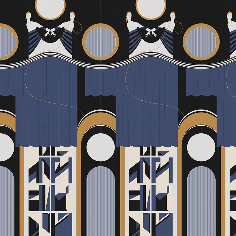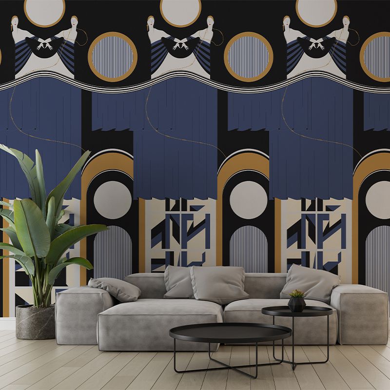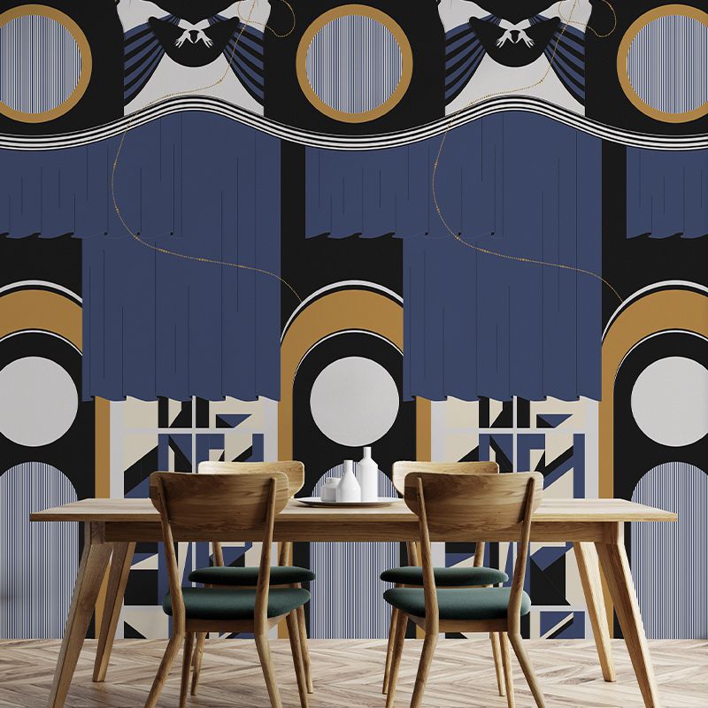 Alege Academy Theatre Blue și transformă-ți spațiul într-un loc elegant și plin de farmec. Acest design unic, cu figuri feminine elegante și arcuri geometrice, adaugă o notă sofisticată și un aer artistic camerei tale. Culorile albastru, negru și auriu se îmbină armonios, creând o atmosferă rafinată și inspirată din epoca Art Deco.