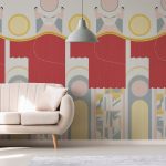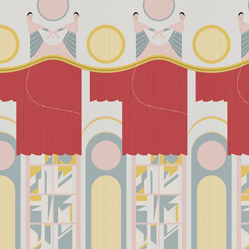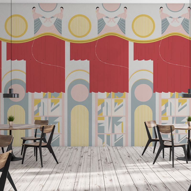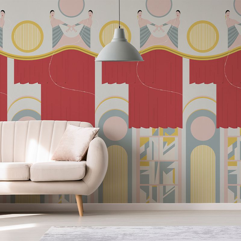 Acest tapet modern cu un design geometric este perfect pentru a adăuga o notă de eleganță și rafinament spațiului tău. Cu o combinație de culori pastelate și un design inspirat de arta deco, acest tapet va transforma orice cameră într-un spațiu unic și sofisticat. Imaginea cu balerine în dans, perdelele roșii și arhitectura geometrică vor crea o atmosferă plină de viață și energie pozitivă.