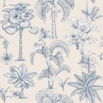 Evocă un sentiment tropical cu acest tapet elegant. Model cu palmieri albaștri pe fundal bej, ideal pentru un decor rafinat și relaxant.
