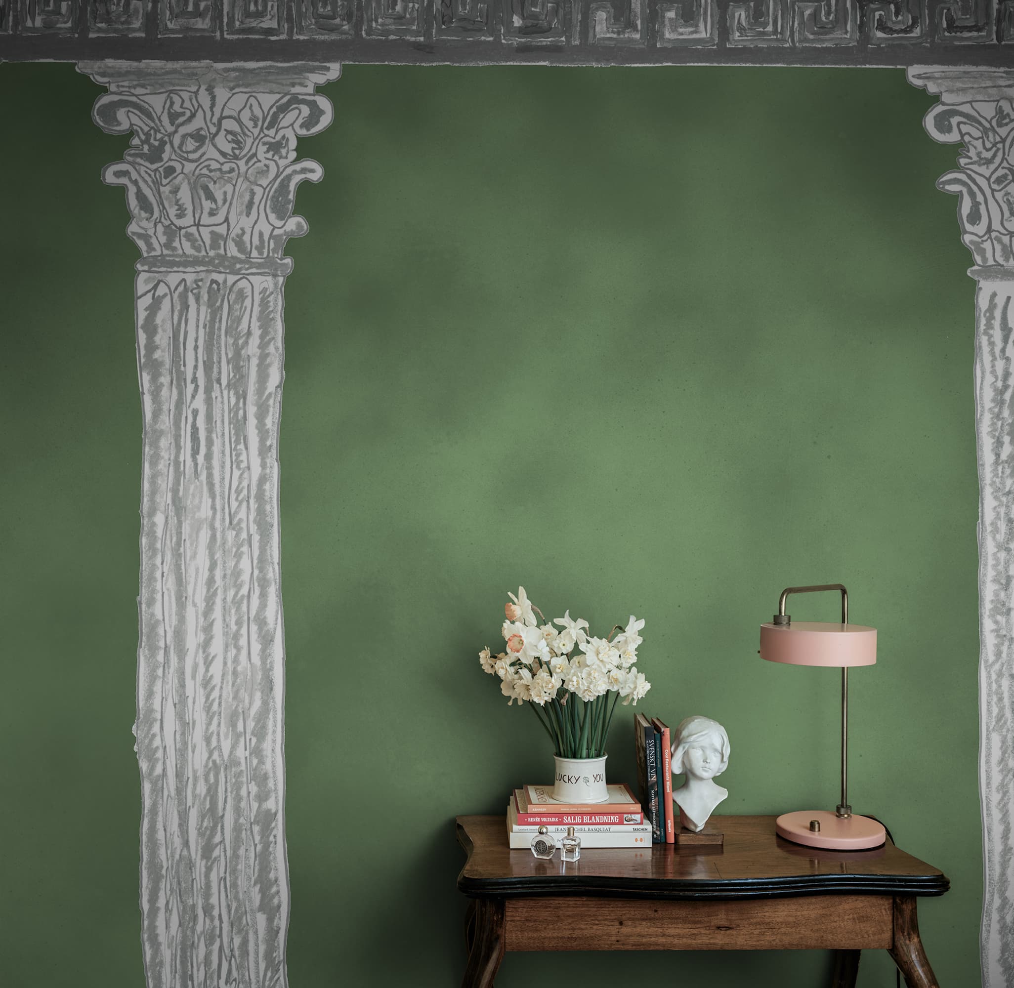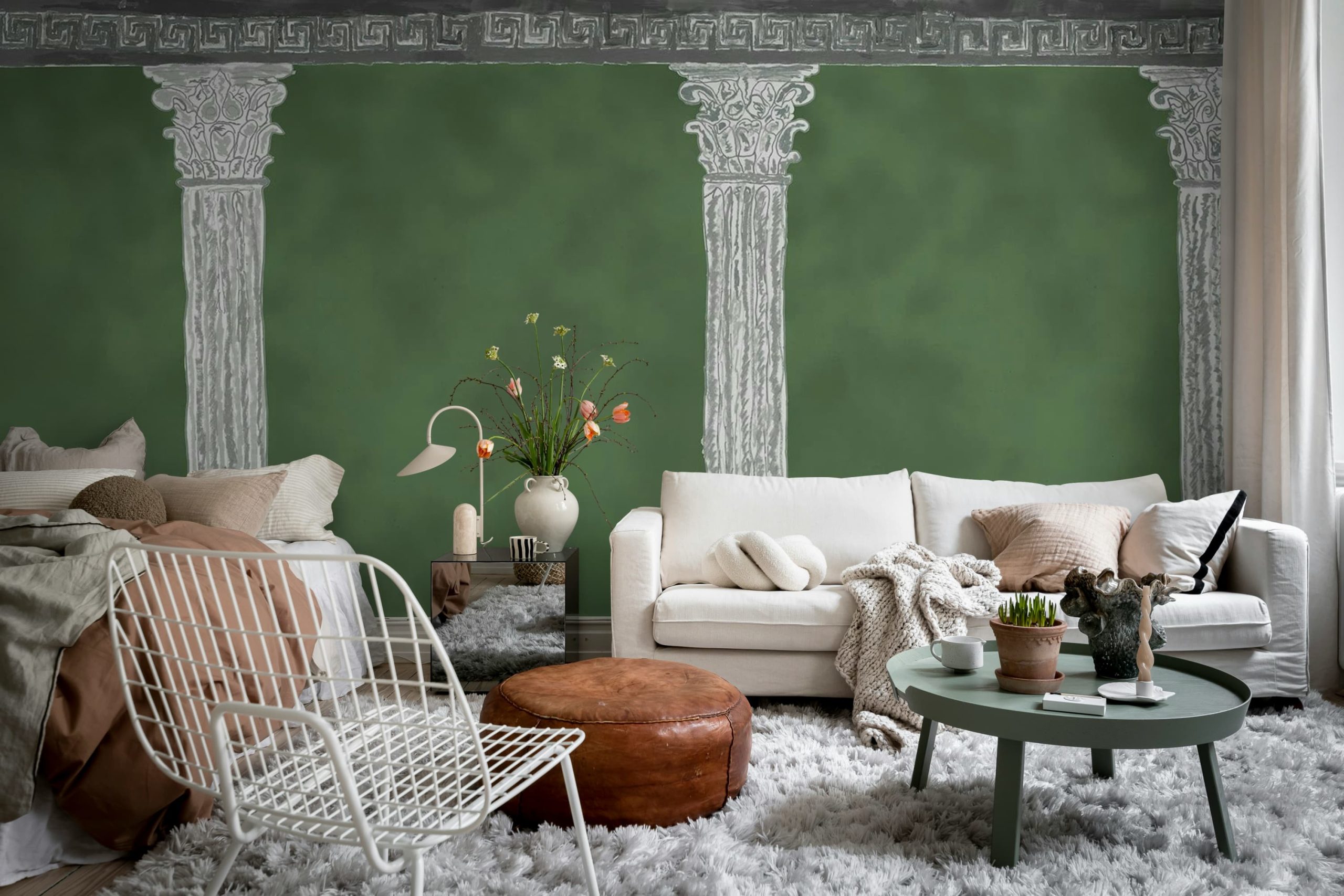 Descoperiți tapetul Aegis Green, o colaborare extraordinară cu John-John. Inspirat de arhitectura clasică, coloanele sale corintice și modelul de cheie greacă evocă eleganța și atemporalitatea. Perfect pentru a adăuga ordine și istorie oricărei încăperi, acest tapet premium spune o poveste și transmite bucurie. Înălțați-vă spațiul cu acest design exclusiv.