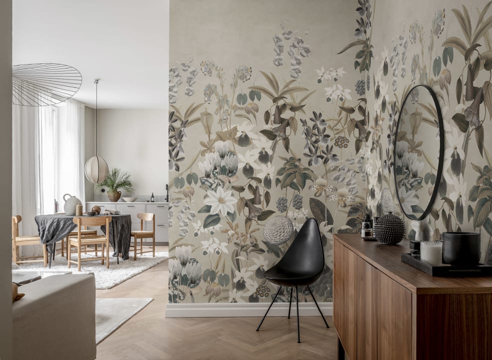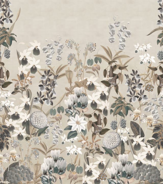 Orhideele, ciclamenele, zinnia și clematitele sunt flori care se găsesc în acest model. Alice’s Garden, Sand are un fundal bej și nuanțe deschise.
