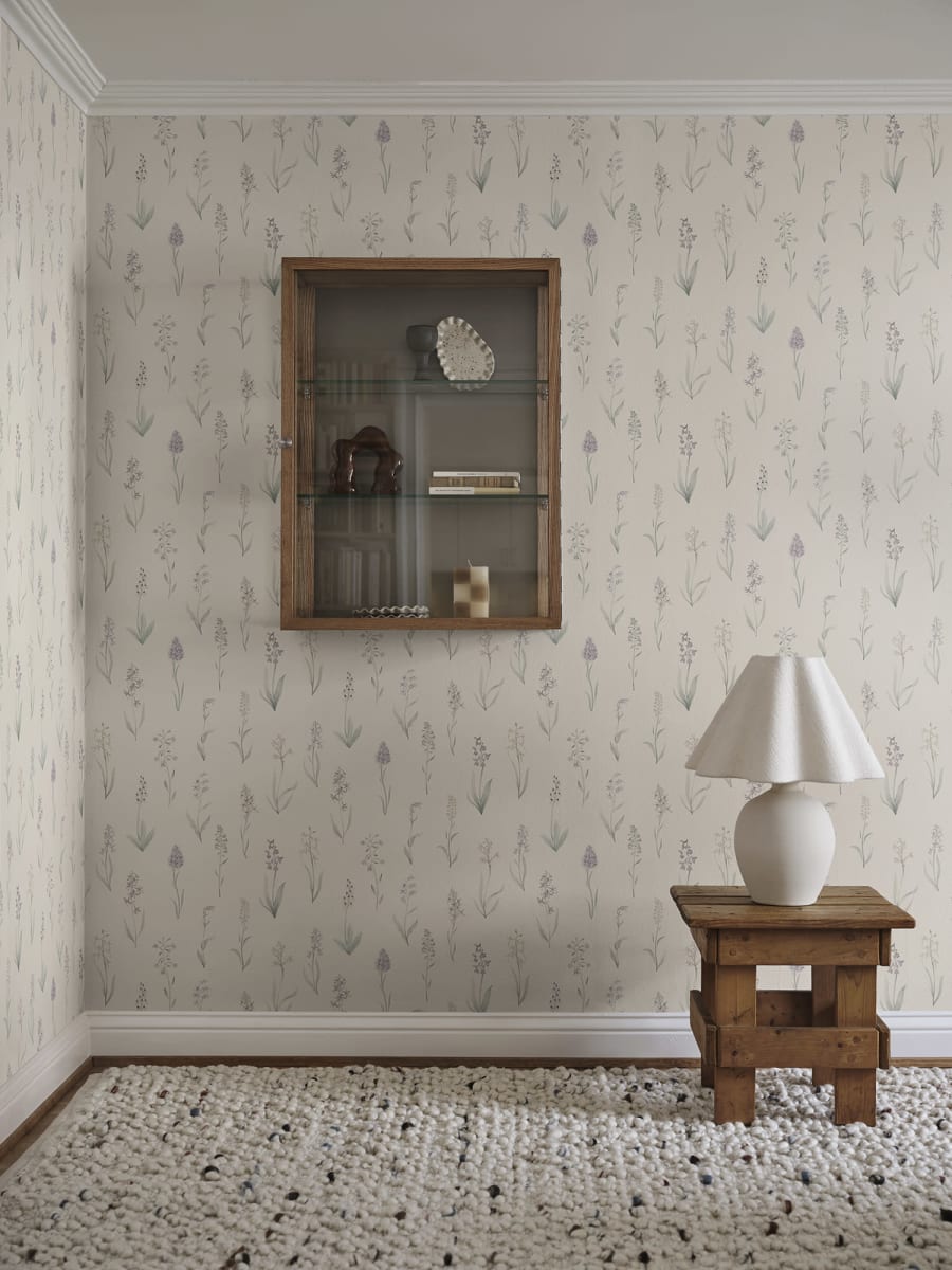 Sanna light blue este un tapet decorat cu flori de mazăre dulce care plutesc grațios pe deasupra peretelui. Floarea a