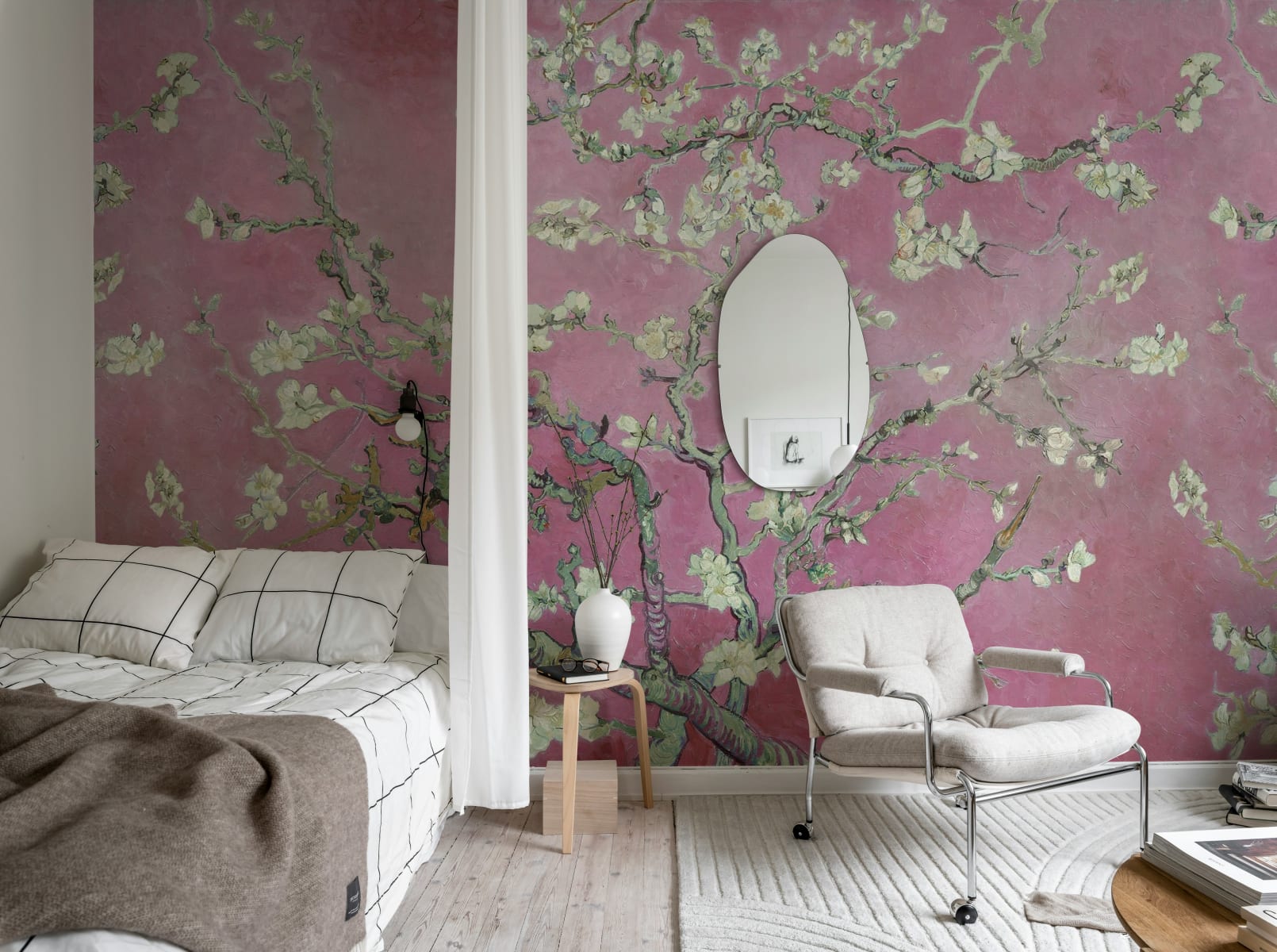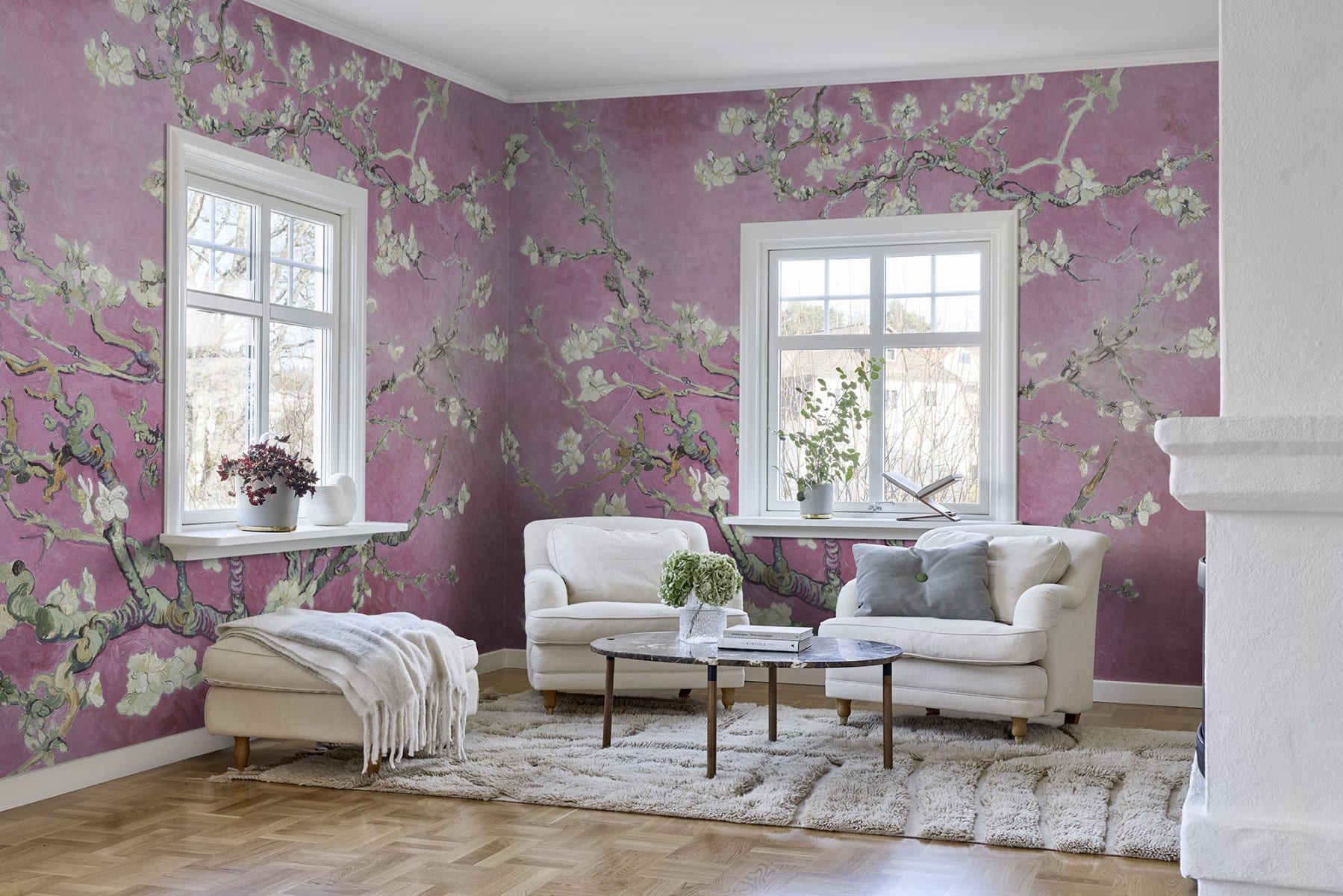 Almond Blossom, Pink, este o versiune repetabilă a tapetului cu faimoasele lucrări de artă ale lui Van Gogh cu flori de migdal. Motivul este adesea văzut ca un simbol al speranței, reînnoirii și noilor începuturi. Culoarea roz prezintă un migdal cu flori albe pe o bază roz.