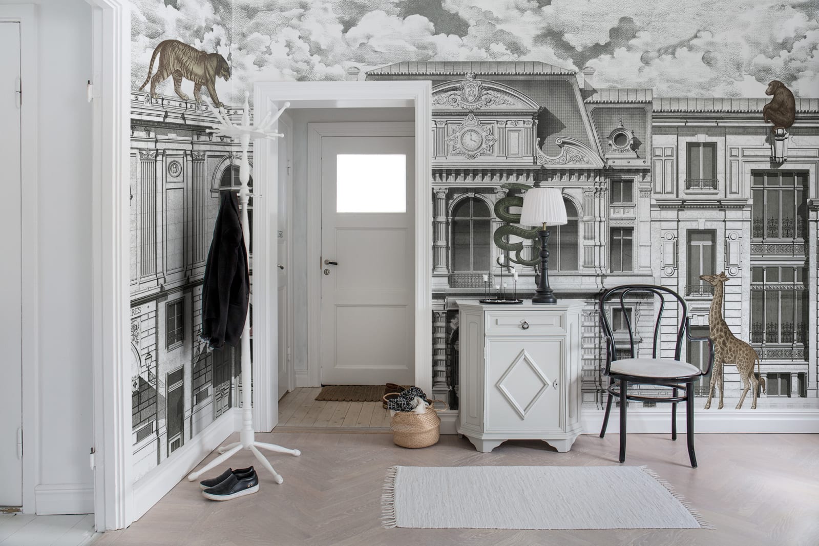 În acest fototapet, orașul este vizitat de o mulțime rar văzută. Tigri în dungi, flăcări roz și girafe plimbătoare cu grație împodobesc acest peisaj urban.
