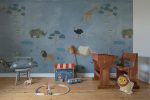 Fototapetul personalizat World Map, Blue, de la Rebel Walls, este o altă reprezentare estetică a hărții mapamondului, de această dată