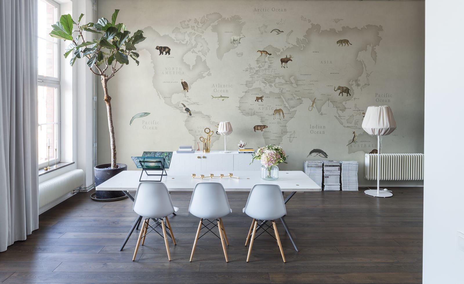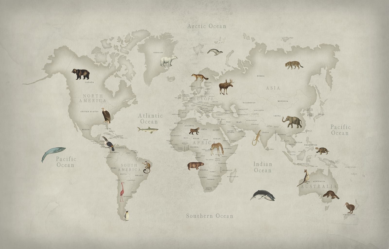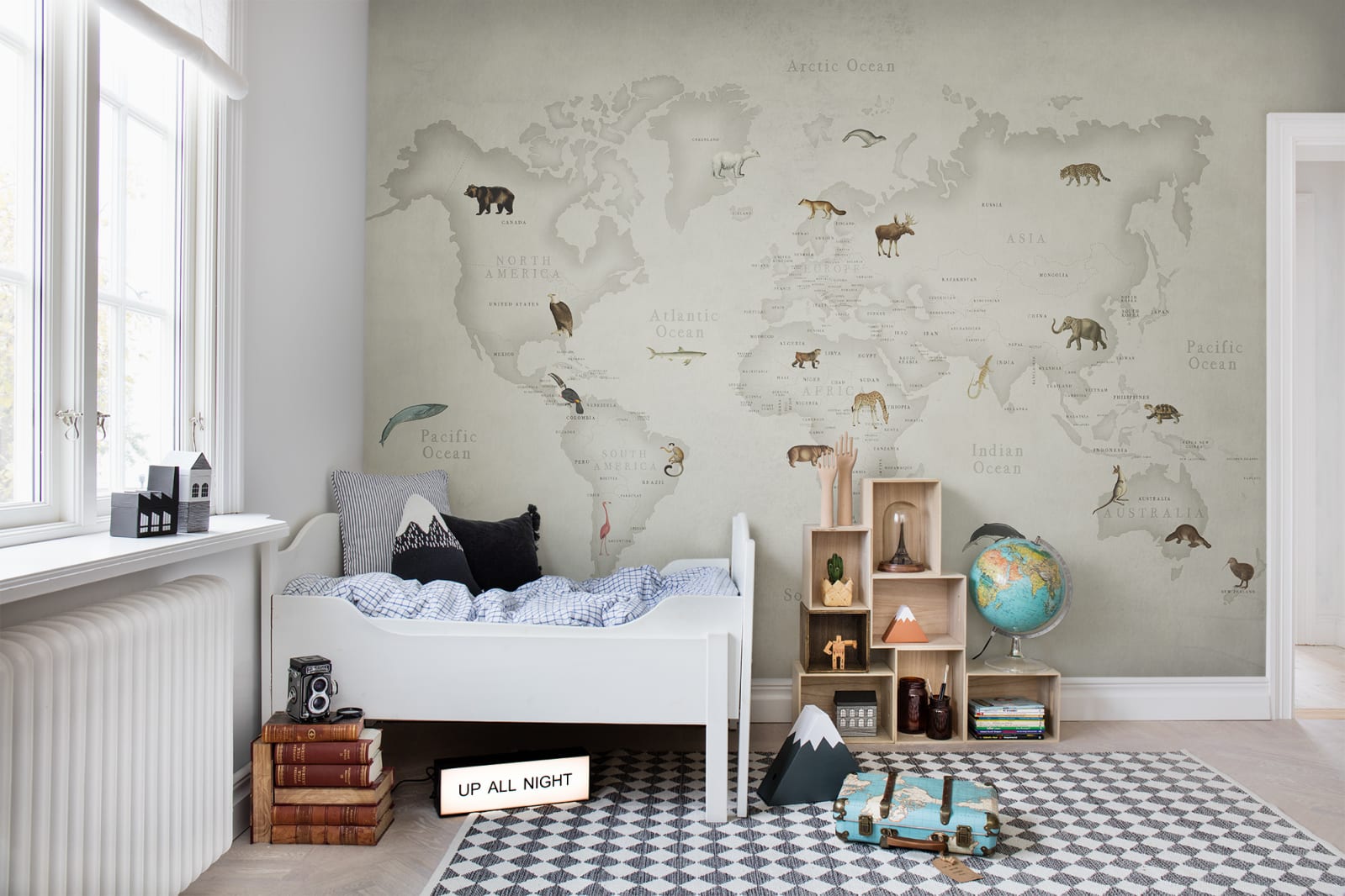 Fototapetul personalizat 3D Animal World, de la Rebel Walls, este perfect pentru camera copiilor și le va capta atenția. Acest model înfățișează o hartă a lumii și o selecție de animale dispuse în zonele din care provin. Copiii vor fi încântați de el, stimulați să învețe și dornici să facă și alte descoperiri.