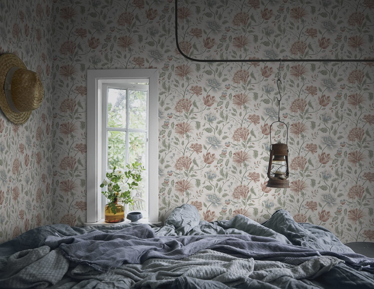 Amploarea îndrăzneață a acestui design floral emană delicatețe, căldură și romantism. Panseluțele delicate din design sunt simboluri ale gândirii. Ele își derivă numele din cuvântul francez penser, a gândi. Bujorul parfumat simbolizează dragostea, fericirea, romantismul și prosperitatea. Varianta Annabelle Terracotta vine în nuanțe de culoarea pământului.