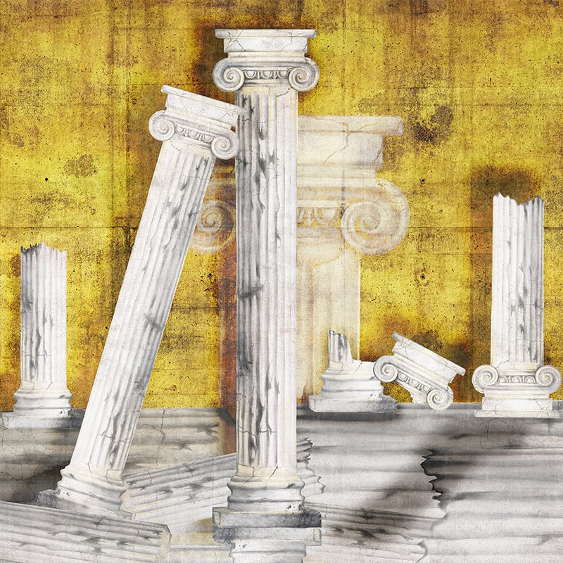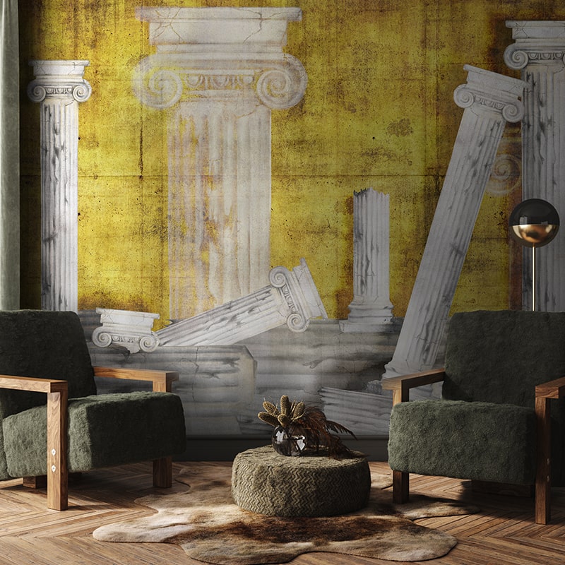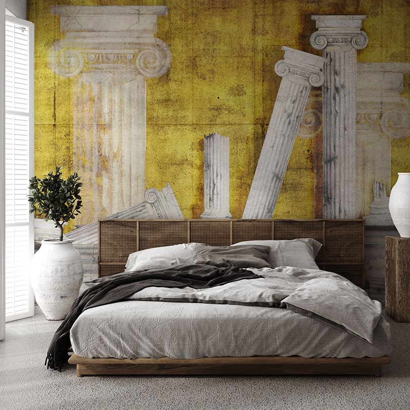 Acest tapet cu coloane antice din alabastru pe fond auriu adaugă un aer elegant și sofisticat oricărei încăperi. Imprimeul rafinat, cu detalii de aur, creează o atmosferă grandioasă, transformând spațiul într-o oază de lux. Ideal pentru living, dormitor sau chiar o baie elegantă, acest tapet va deveni un punct focal captivant. Calitatea superioară a materialelor asigură durabilitate și o experiență de design impecabilă.