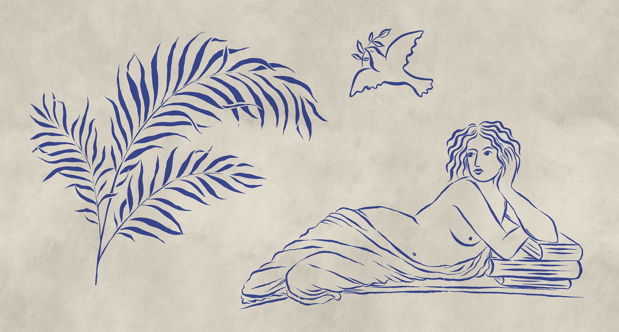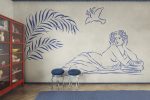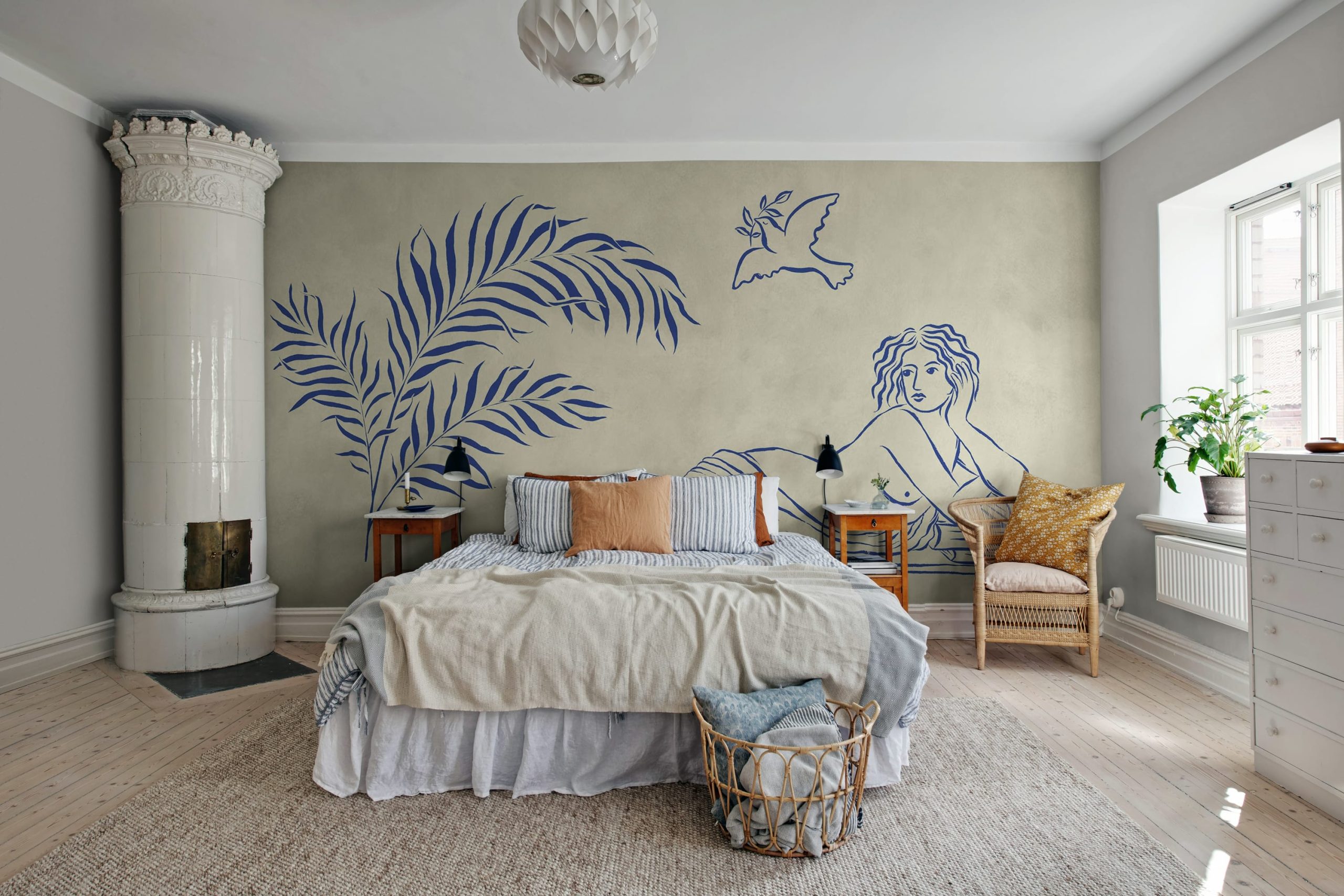 Aduceți eleganță atemporală spațiului dvs. cu acest tapet în nuanțe de albastru. Acesta prezintă o figură culcată, o frunză de palmier și un porumbel al păcii în linii de cerneală moi. Această operă de artă este o aluzie la sculptura clasică și la liniște, adăugând un farmec subtil, dar sofisticat oricărei încăperi.