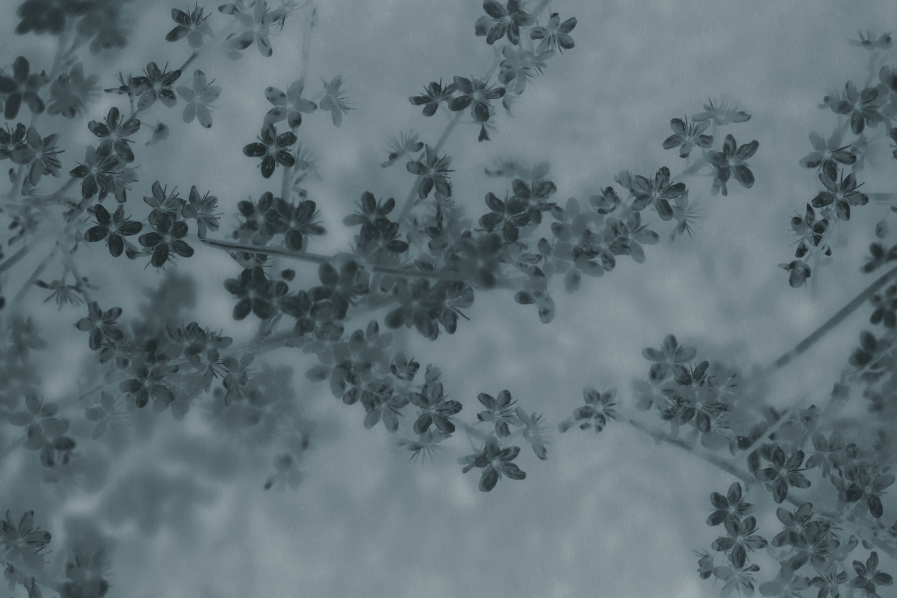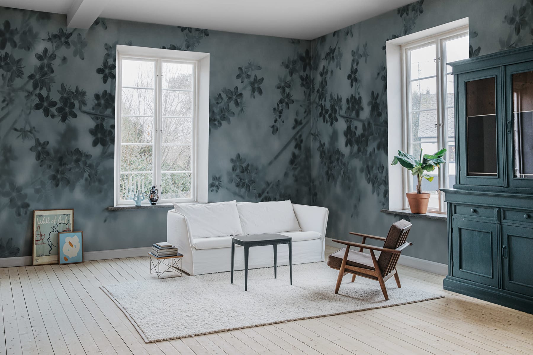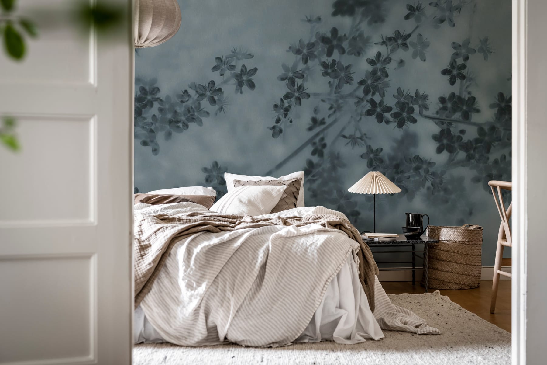 Petalele mărite de flori de măr se revarsă pe perete, formând un aspect grafic captivant. Acest design de tapet este un exemplu remarcabil de fotografie artistică redefinită, cu efectul său visător și focalizarea moale, oferind o senzație vizuală artistică. Paleta de culori Blue este realizată în nuanțe de albastru închis.