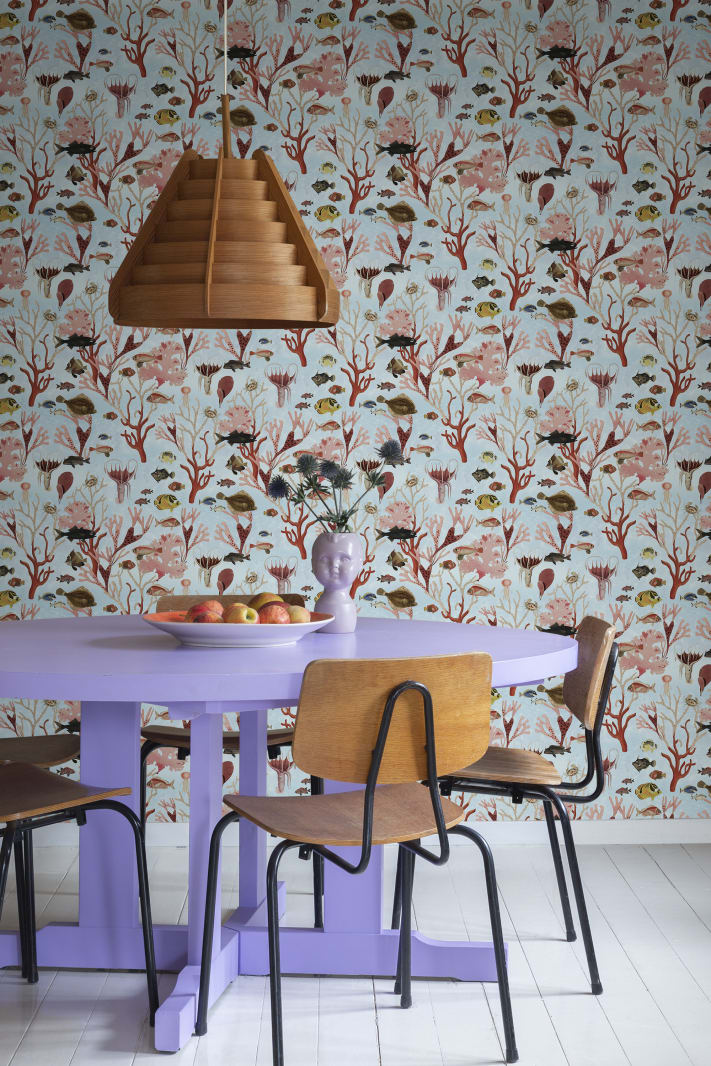 De ce să nu ai un acvariu pe peretele tău? Pești și caracatițe strălucitoare, viu colorate, printre alge marine care flutură, creează un model proiectat cu pricepere. Nu este greu de imaginat cum ar putea curge tema subacvatică în restul decorului interior.