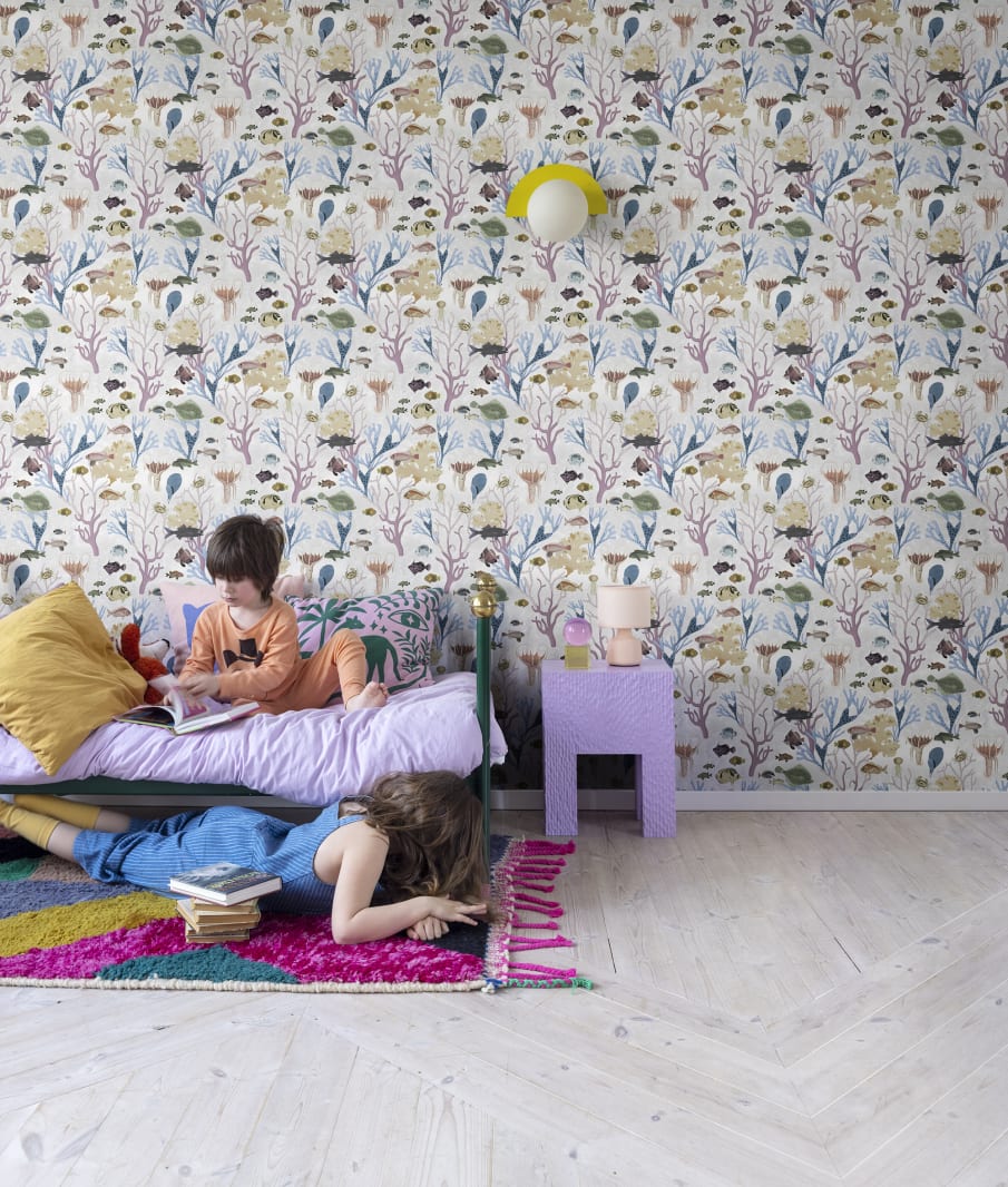 Pești și caracatițe strălucitoare, viu colorate, printre alge marine care flutură, creează un model proiectat cu pricepere în tapetul Aquarium. Aici în culori pastelate liniștitoare.