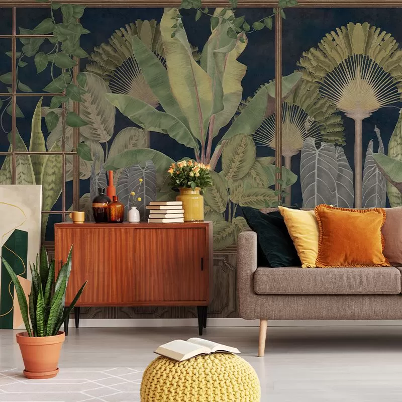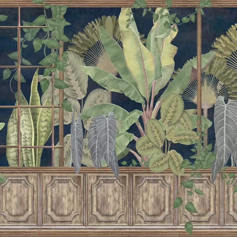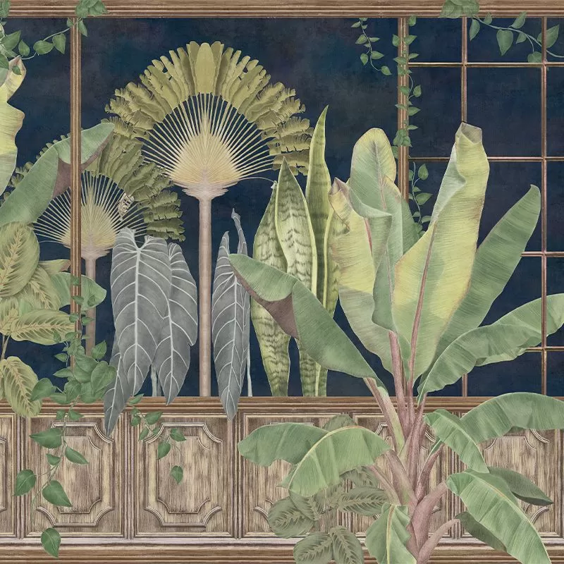 Modelul de tapet Arboretum propune un decor extrem de elegant, în care frunzele glorioase ale plantelor exotice domină mare parte din imagine. Cadrul din lemn masiv, cu ornamente aplicate, încadrează sera într-un stil de amenajare de tip vintage. Geamurile atent realizate ofera contextului transparențe și textură, surprinzând prin nota de autenticitate pe care o conțin.