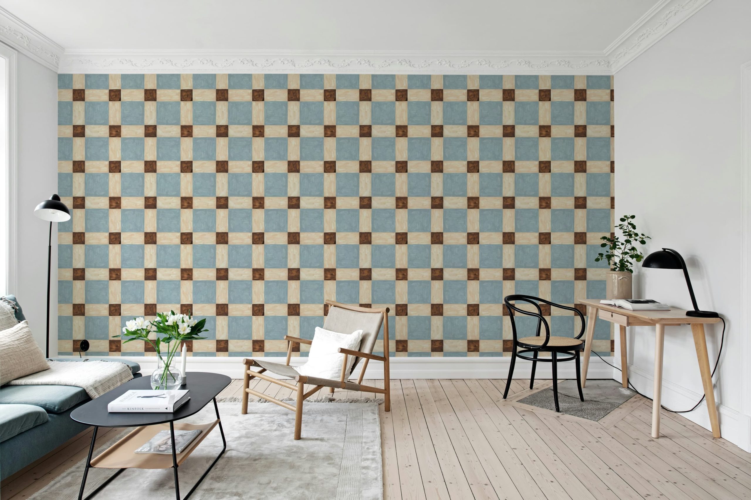 Transformă-ți spațiul cu un tapet cu design geometric! Modelul cu pătrate în nuanțe de albastru și maro aduce un aer sofisticat și elegant oricărei încăperi. Un decor perfect pentru un interior modern și stilat.