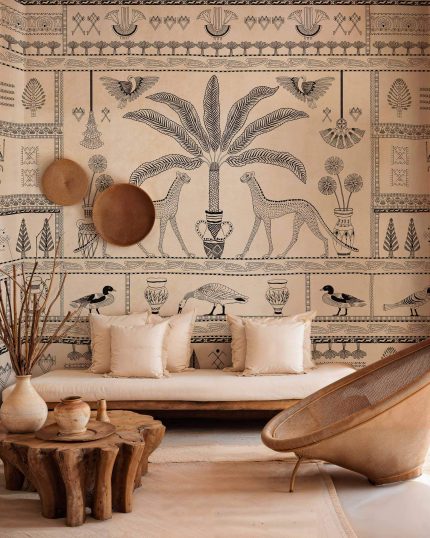 Tapetul lavabil Asni Valley de la Coordone este un model inspirat de animale din colecția Berber și prezintă animale iconice împletite cu motive naturale și ornamente.