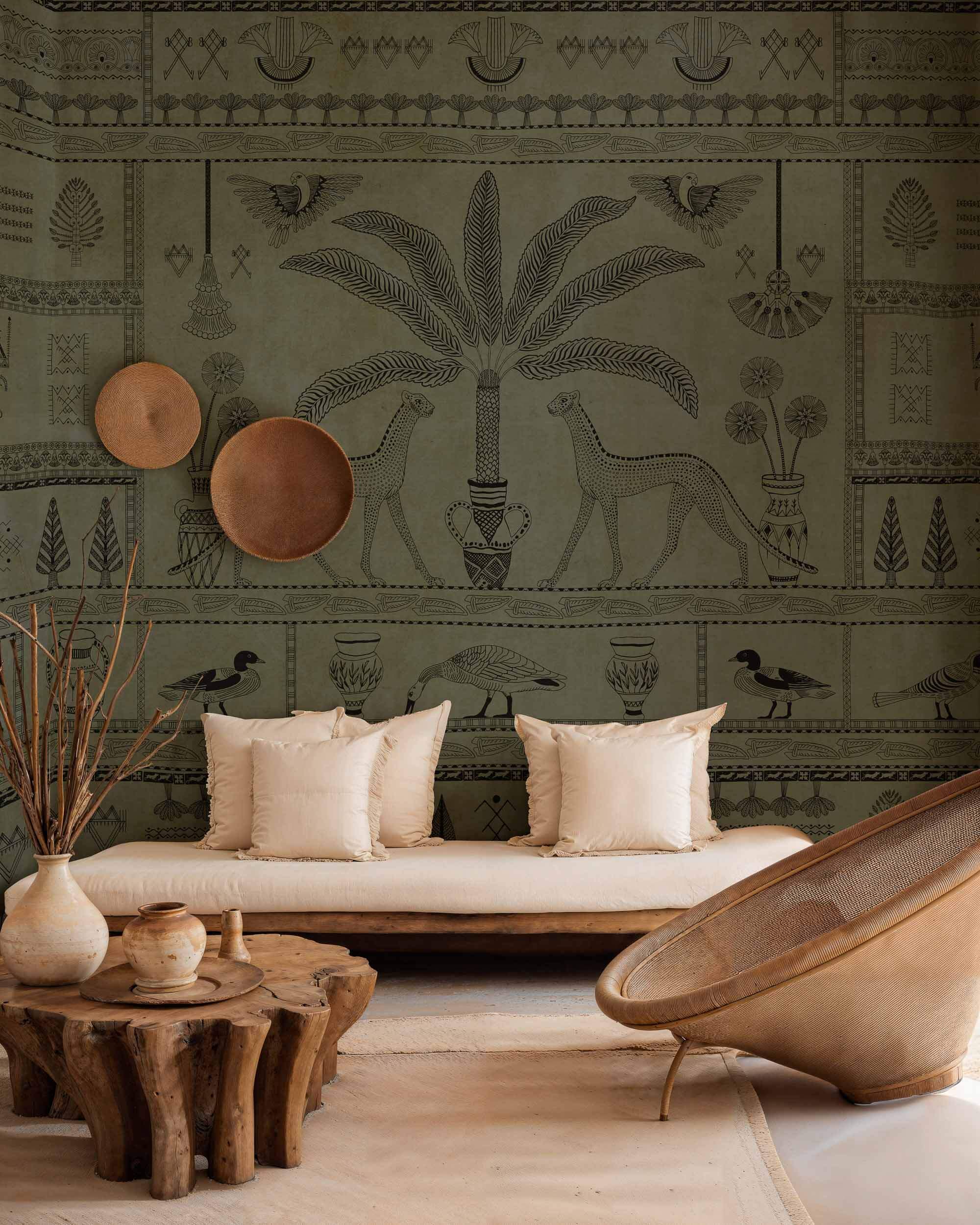 Tapetul lavabil Asni Valley de la Coordone este un model inspirat de animale din colecția Berber și prezintă animale iconice împletite cu motive naturale și ornamente.