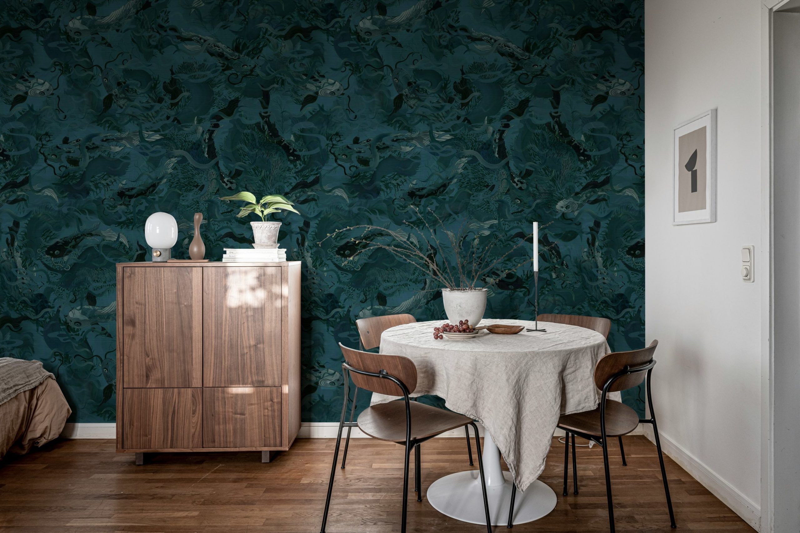 Creează un ambient captivant cu acest tapet elegant, cu un model subtil de pești în nuanțe întunecate. Perfect pentru un dormitor relaxant sau un living sofisticat.