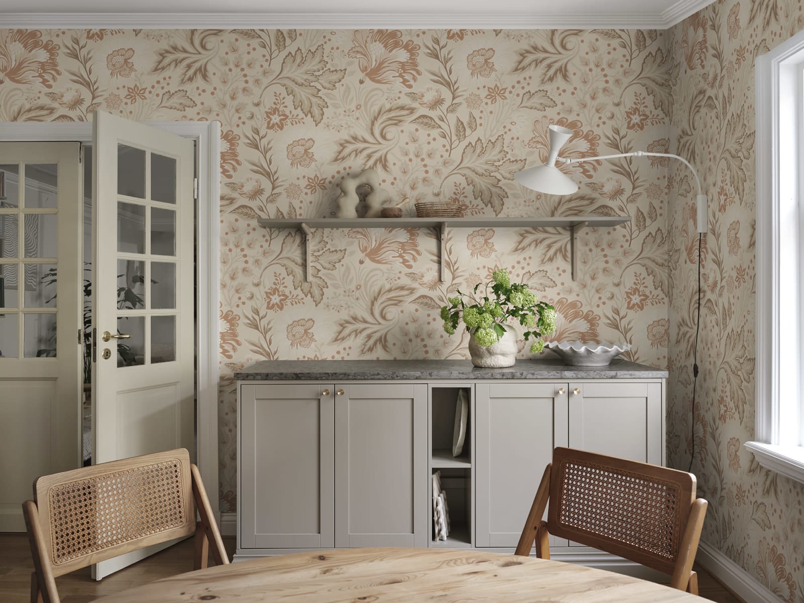 Ava Mural este o versiune grandioasă a tapetului nostru îndrăgit, Ava. Un model cu flori mari, luxuriant, magnific și elegant, care creează o atmosferă de care te poți îndrăgosti mereu. Ava Mural este un design încântător care funcționează excepțional de bine în dormitoare, camere de zi și camere pentru copii. Schema de culori Hazel este caldă și primitoare, cu nuanțe de bej moale, maro și roșu teracotă.