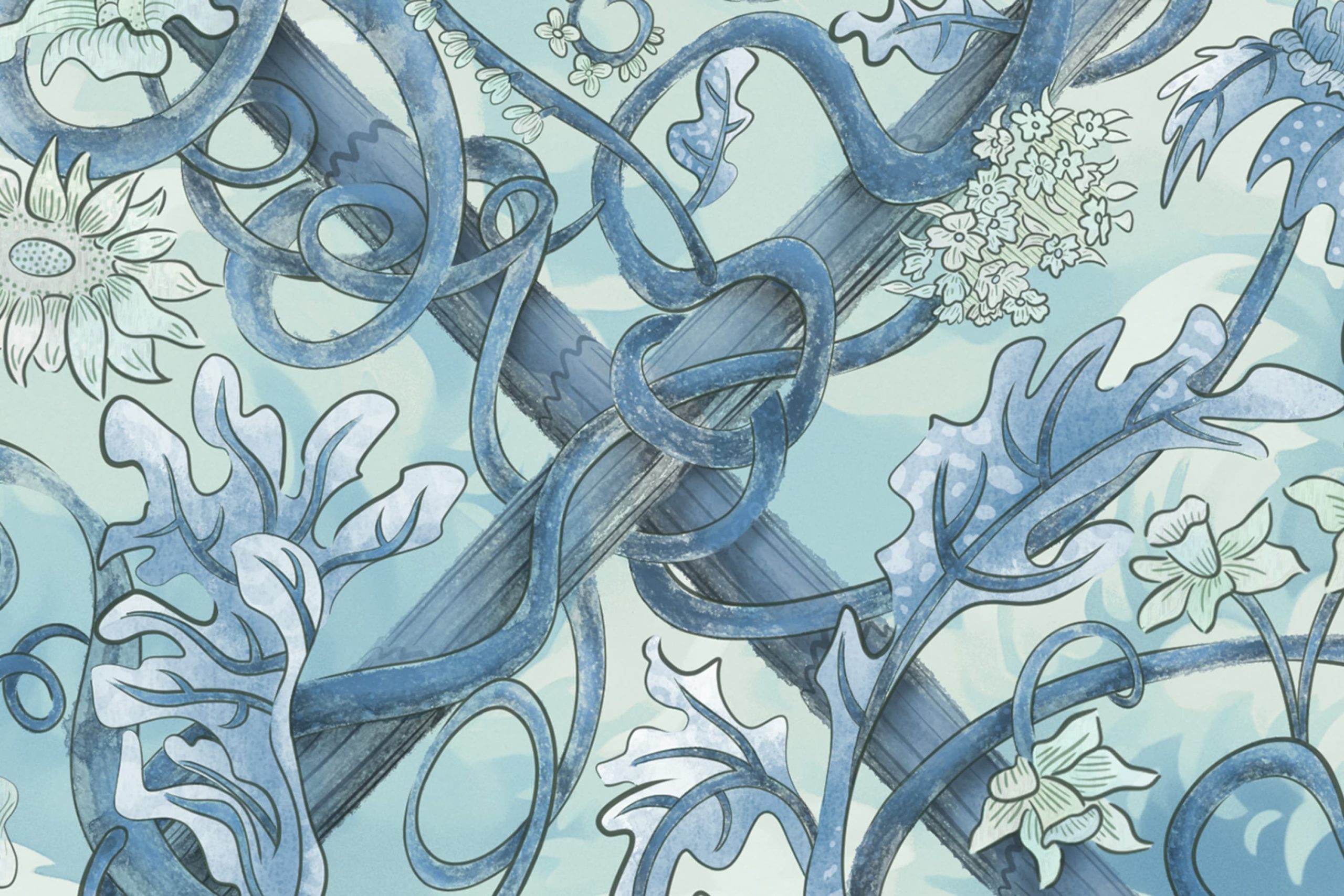 Acest tapet creează o atmosferă visătoare, transformând orice cameră într-un spațiu unic. Perfect pentru living, dormitor sau birou. Un model elegant cu un design abstract, pe un fundal albastru pal.