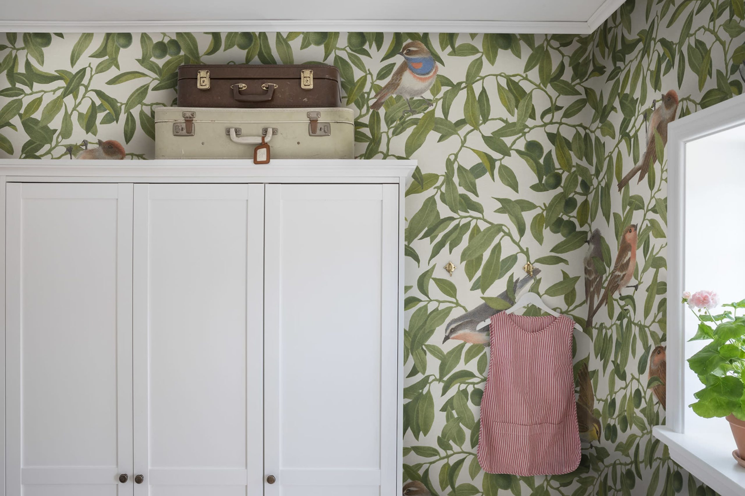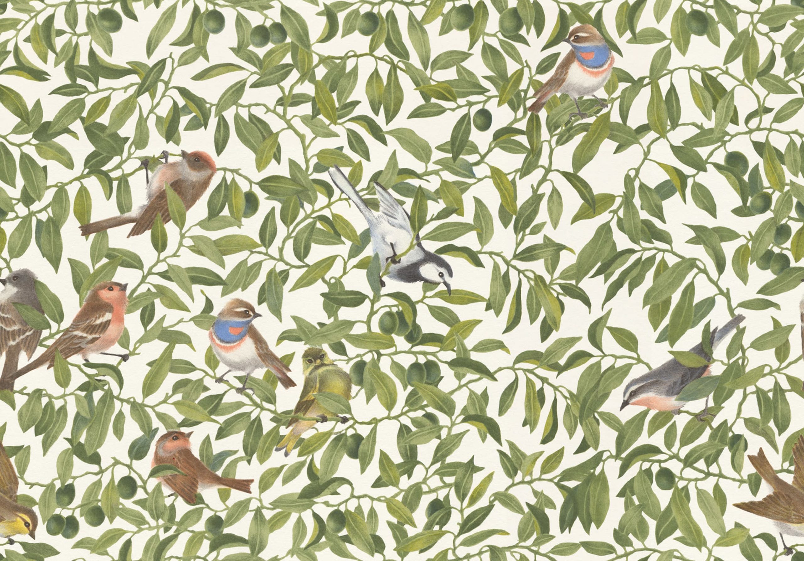 Păsări detaliate de diferite soiuri drăguțe se plimbă printr-un tufiș bogat, ilustrate de faimosul artist Ilon Wikland, cel mai cunoscut pentru ilustrațiile sale fantastice din cărțile pentru copii ale lui Astrid Lindgren. Varianta de culoare Alb are păsări colorate și vegetație pe un fundal alb.