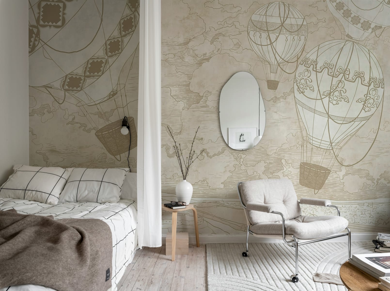 Tapetul Balloon Travelers, Beige prezintă baloane cu aer cald care plutesc pe un cer frumos ilustrat, cu tonuri moi de bej care creează o estetică liniștitoare, de inspirație vintage. Perfect pentru camere de copii sau spații creative, acest tapet evocă un sentiment de explorare și uimire. Paleta de culori neutre se îmbină perfect cu o varietate de stiluri de interior, făcându-l în același timp jucăuș și sofisticat. Balloon Travelers, Beige este ideal pentru cei care doresc să inspire un sentiment de aventură și seninătate în casa lor, adăugând în același timp o notă de farmec atemporal.