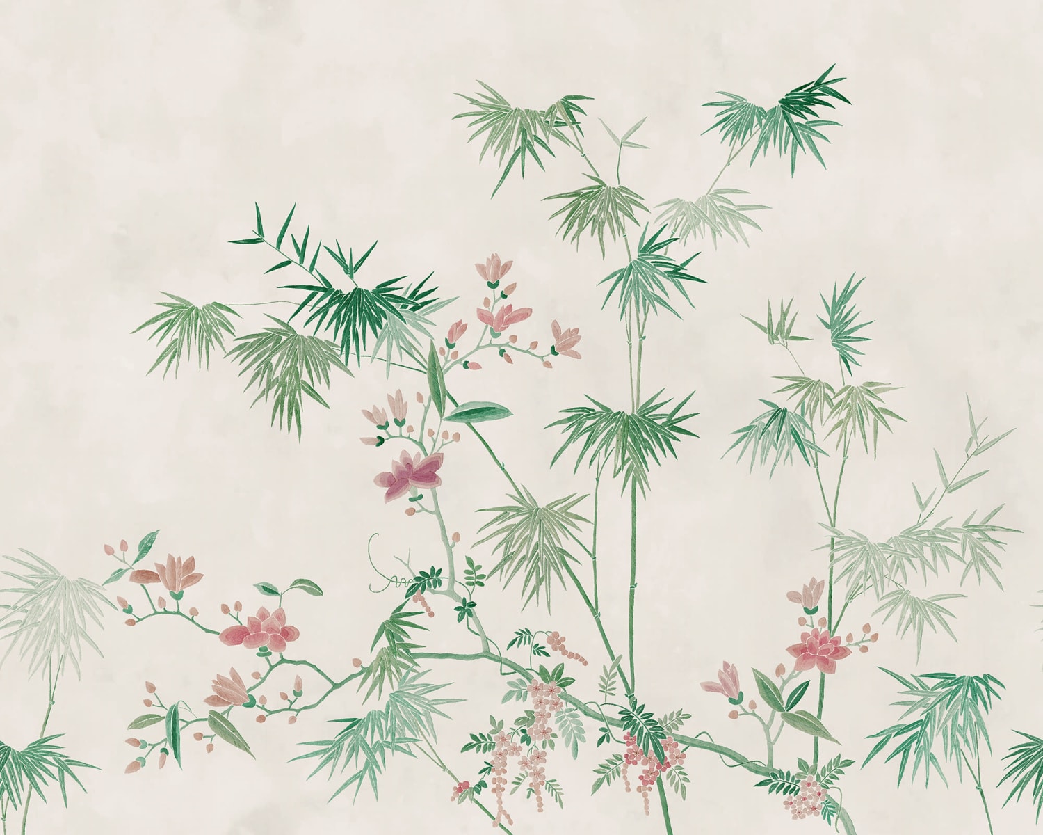 Cu o expresie modernă, această pădure de bambus creează o senzație atemporală și exclusivistă pe perete. Muralul a fost creat din diferite fragmente dintr-o Chinoiserie impresionantă din secolul al 19-lea din Canton, China. Schema de culori Green are o bază frumoasă bej moale și frunze delicate în nuanțe de verde.