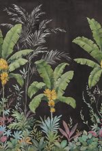 Un design tropical și jucăuș cu bananieri ilustrați în mod uimitor pe un fundal negru solid. Un design distractiv, dar sofisticat, în verde, galben, albastru, roz și alb. De ce să nu creezi acel lounge tropical luxos?