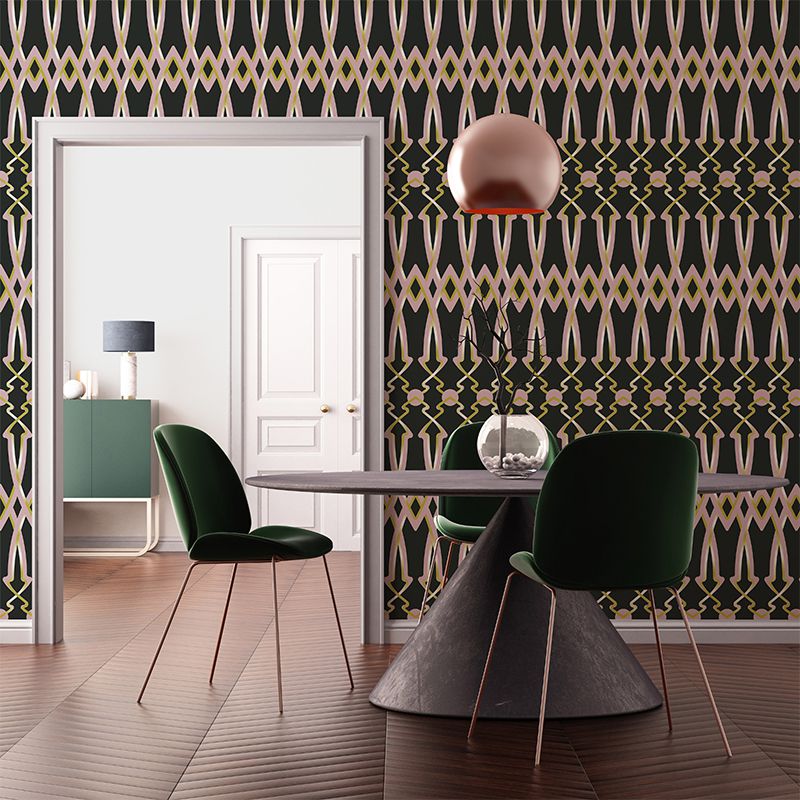 Adăugați o notă de eleganță și rafinament casei dumneavoastră cu acest tapet cu un design geometric complex, în nuanțe de negru, auriu și roz pal. Tapetul este perfect pentru a crea un accent de design modern în living, dormitor sau birou. Designul geometric este sofisticat și elegant, oferind o atmosferă unică și modernă. Tapetul se aplică ușor pe orice suprafață netedă și este rezistent la umiditate.