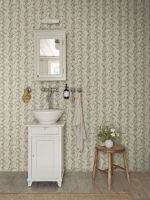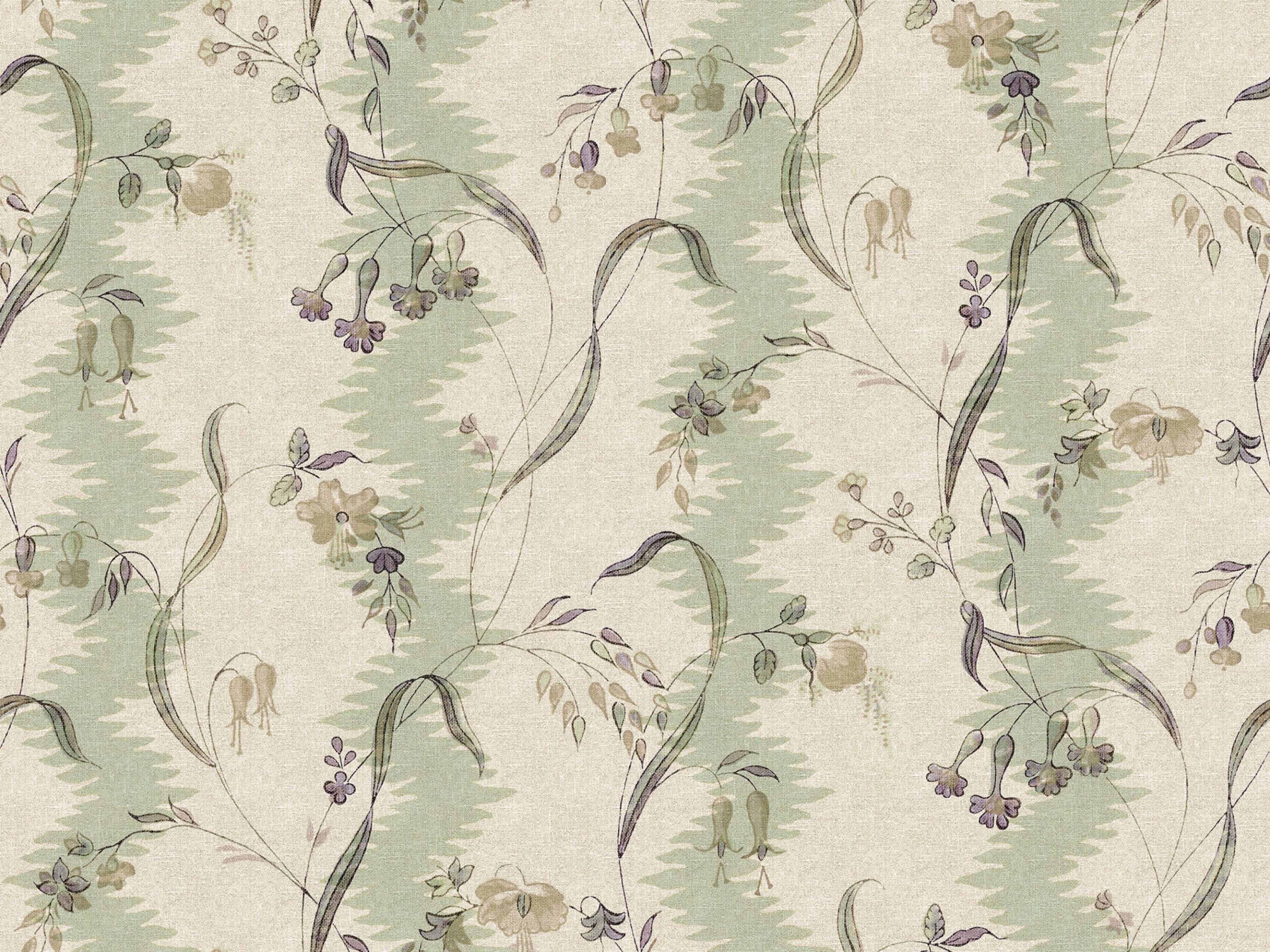 O viță de vie florală atemporală împletită cu o dungă textilă, inspirată de un original italian de la începutul anilor 1900. Beatrice, Light Green are un fundal bej moale cu valuri subtile verzi și flori desenate manual în roșu, verde mat și bej.