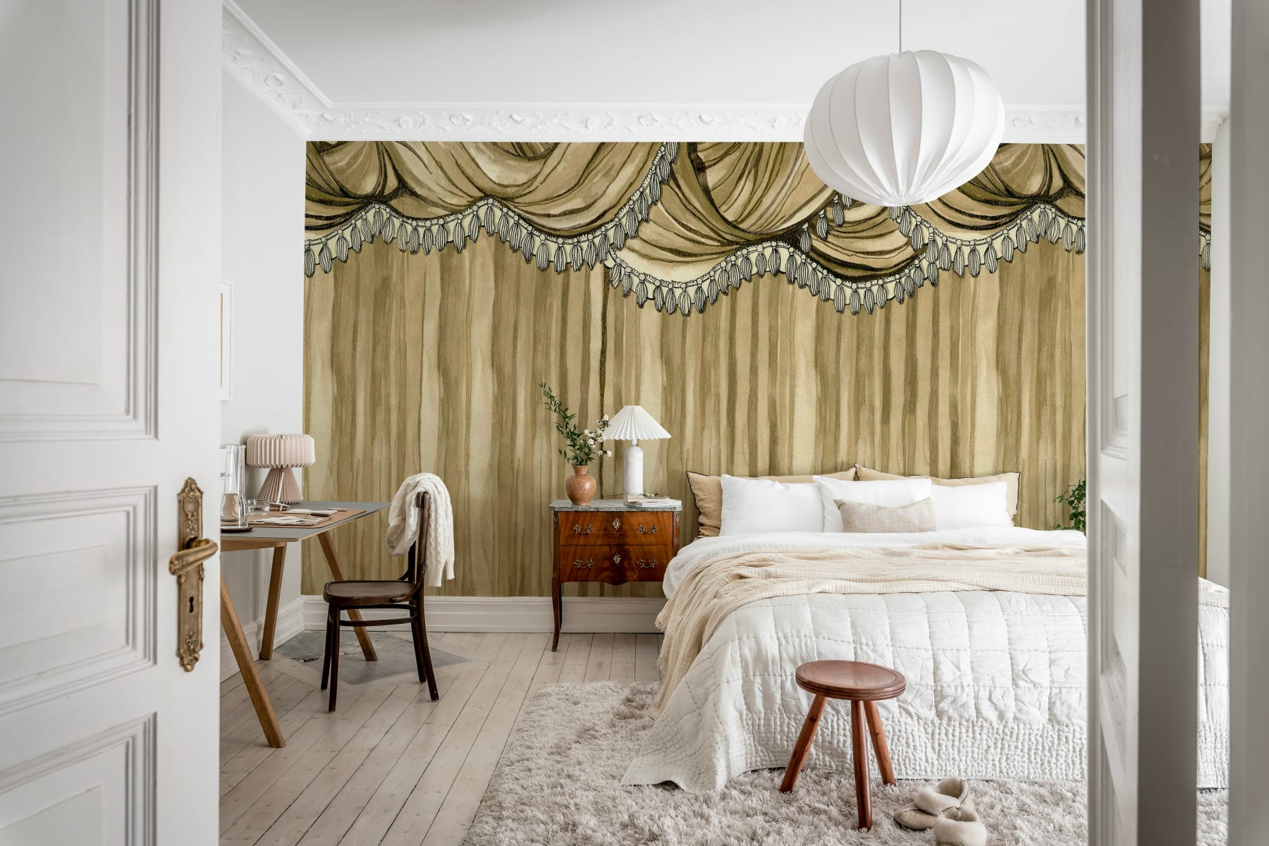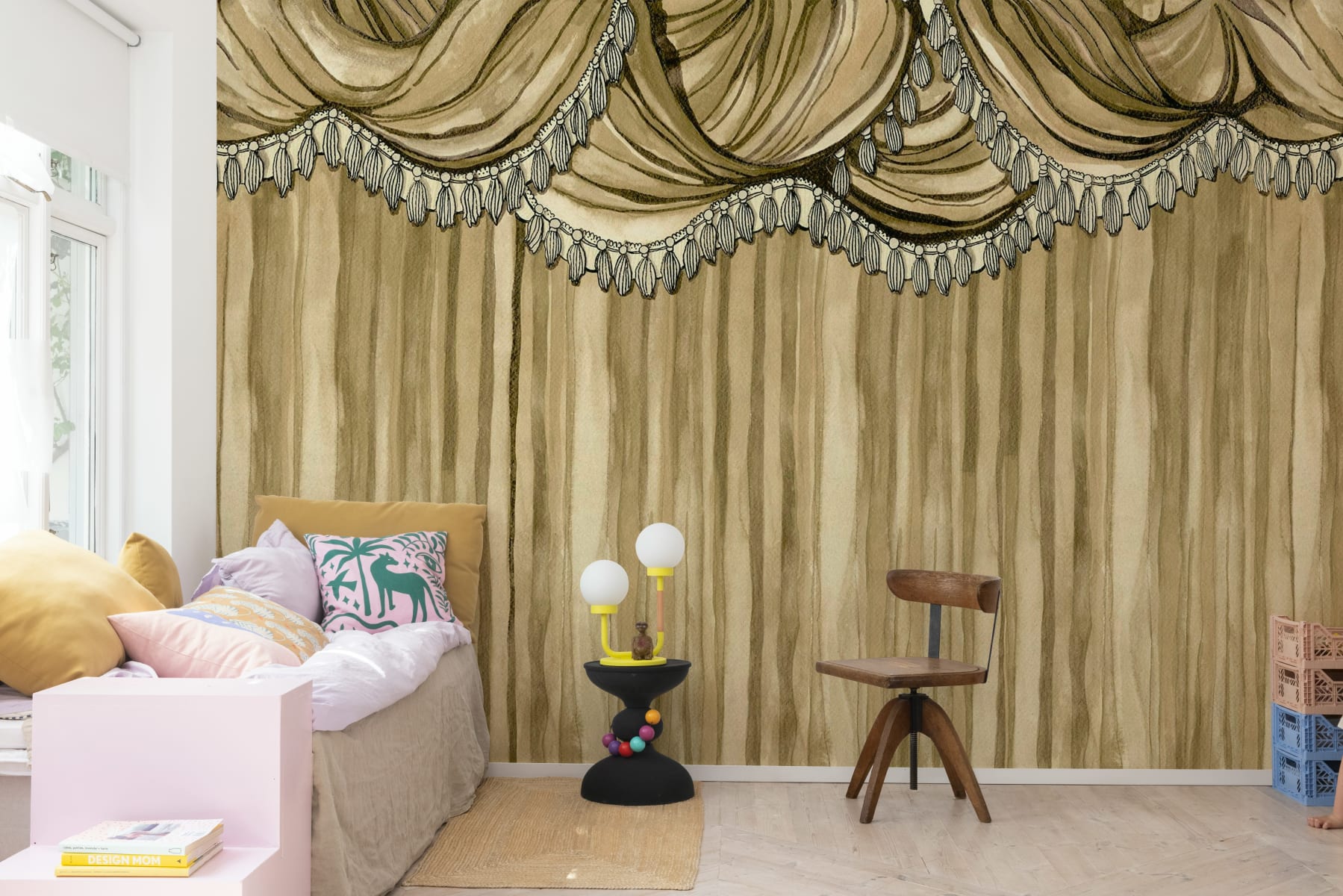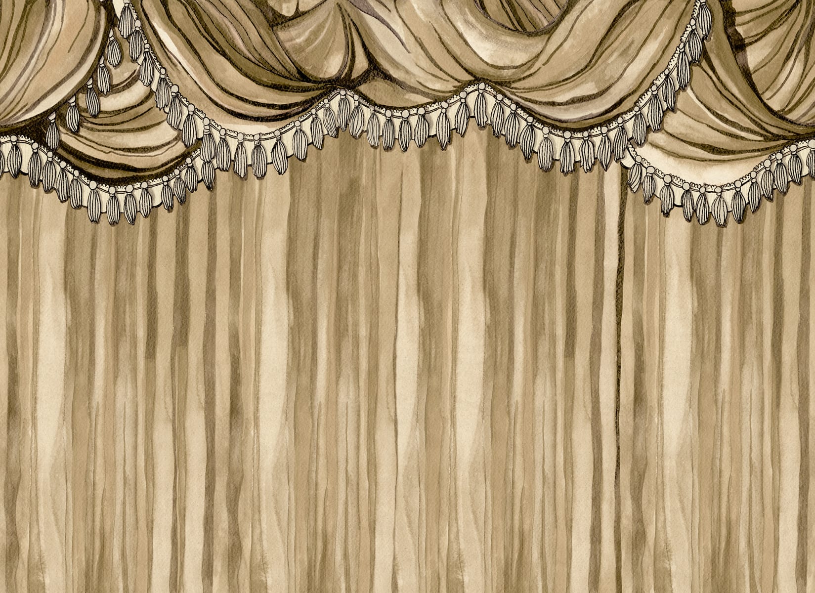 Tapetul Behind the Curtains, Beige prezintă perdele bej frumos detaliate cu ciucuri decorativi, creând o ambianță luxoasă, de inspirație vintage. Tonurile neutre de bej oferă căldură și eleganță, făcându-l ideal pentru camerele de zi, zonele de luat masa sau home theaters, unde se dorește o atingere de dramatism subtil. Acest tapet aduce un sentiment de farmec clasic și grație în orice spațiu, adăugând profunzime și o notă de teatru. Behind the Curtains, Beige este perfect pentru cei care apreciază eleganța discretă, oferind un fundal rafinat, dar captivant pentru orice cameră.